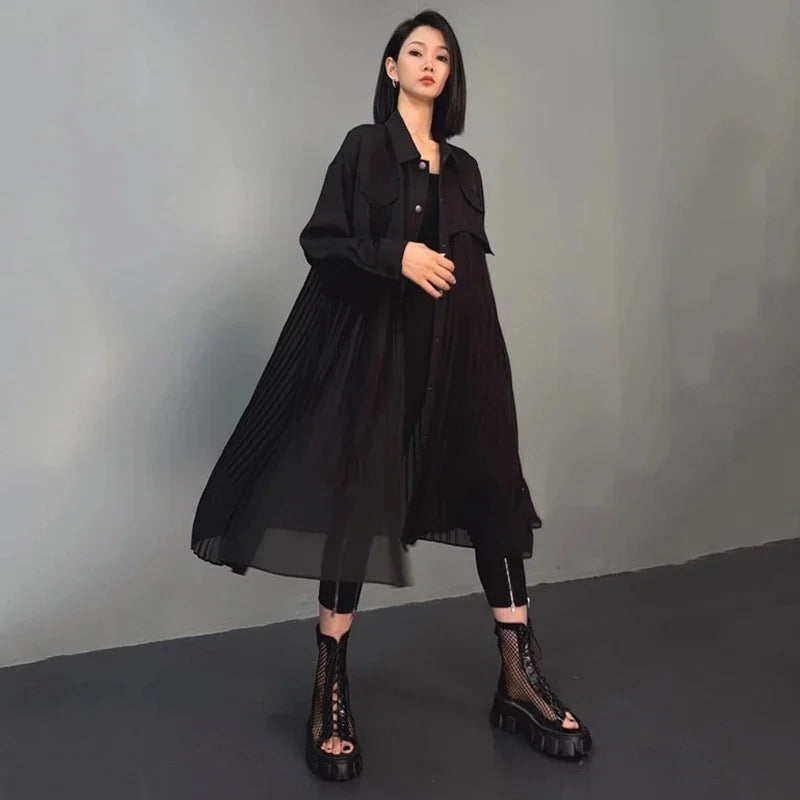 XITAO Mesh Patchwork Casual Shirt Dress Full Sleeve Turn Down Collar Mid-calf Splicing Pleats Single Breasted All Match ZYY1010