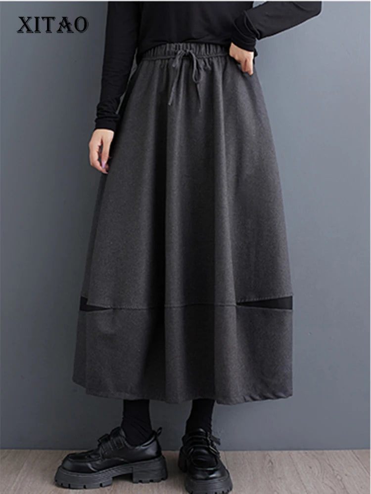 XITAO Casual Solid Color A-line Mid-calf Skirt Contrast Color Patchwork Autumn Women 2024 New Trendy Female Skirt ZYY1090