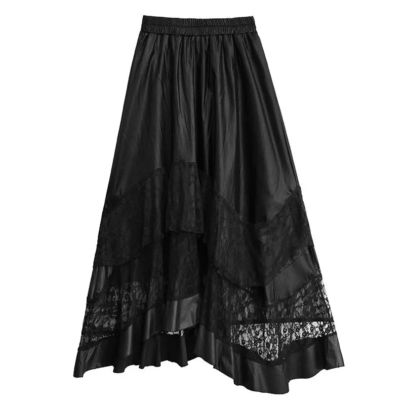 XITAO Lace Patchwork Asymmetrical Skirts Solid Color Elastic Waist Mid-calf Fashion All Match Casual Skirts 2024 Autumn LJ1020