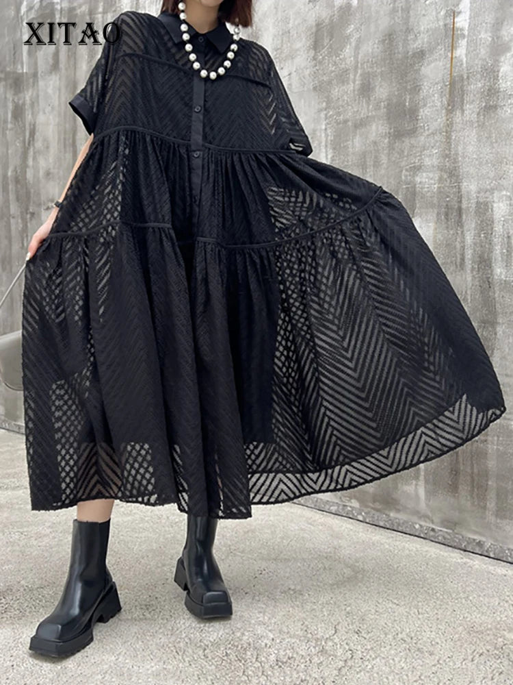 XITAO Solid Color Hollow Out Patchwork Dress Short Sleeve Fashion Loose Casual Summer Female Single Breasted Dress LYD1829